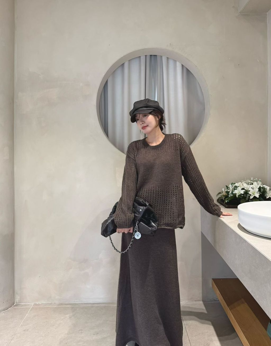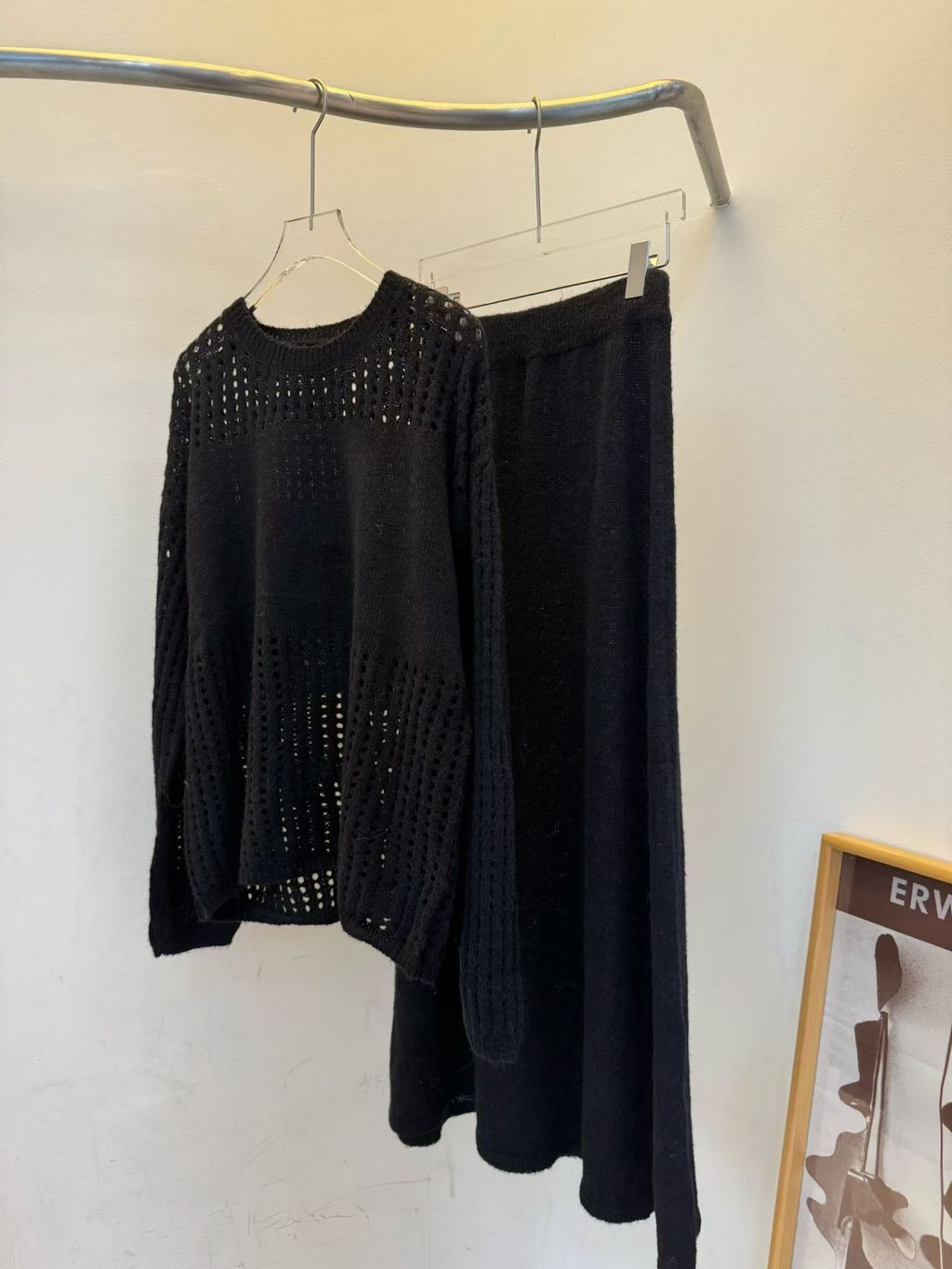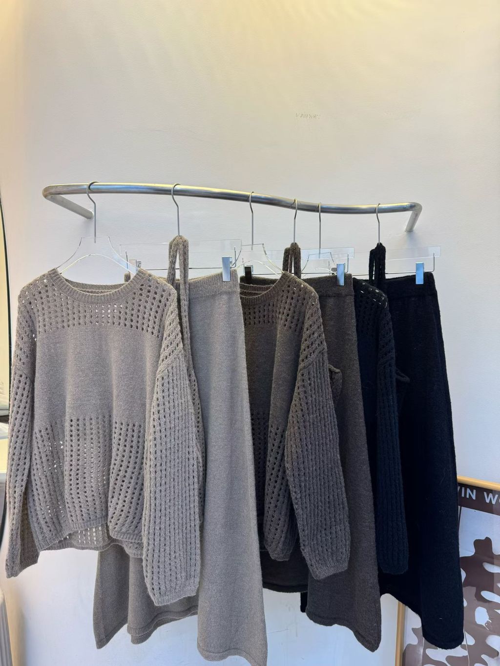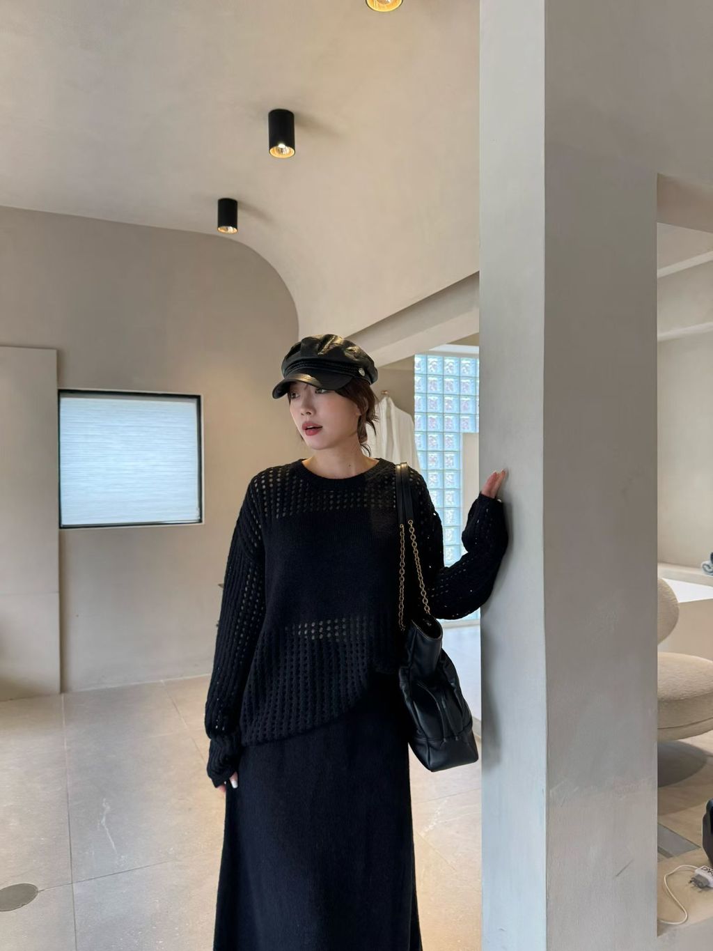 d5205-鏤空針織衫+針織長裙套裝(送針織肩包)