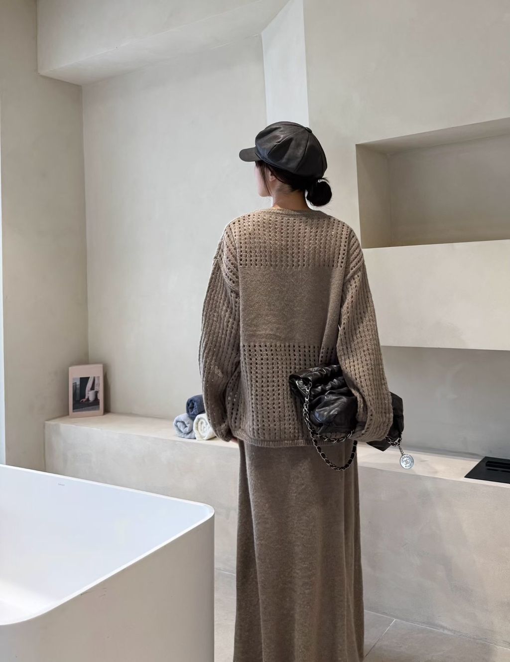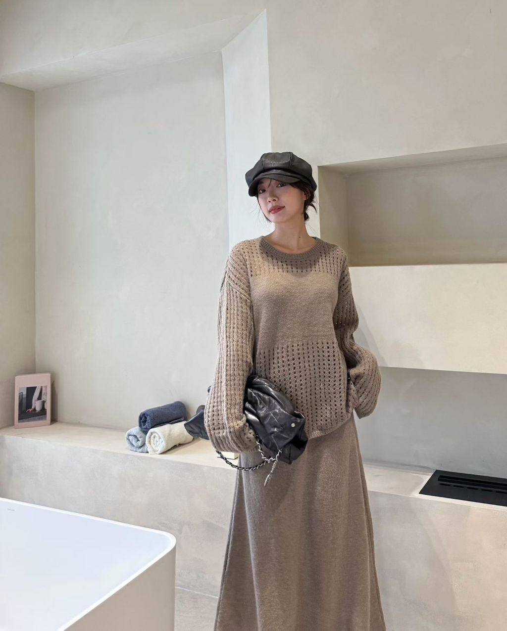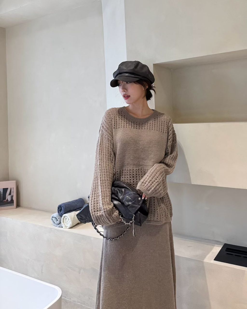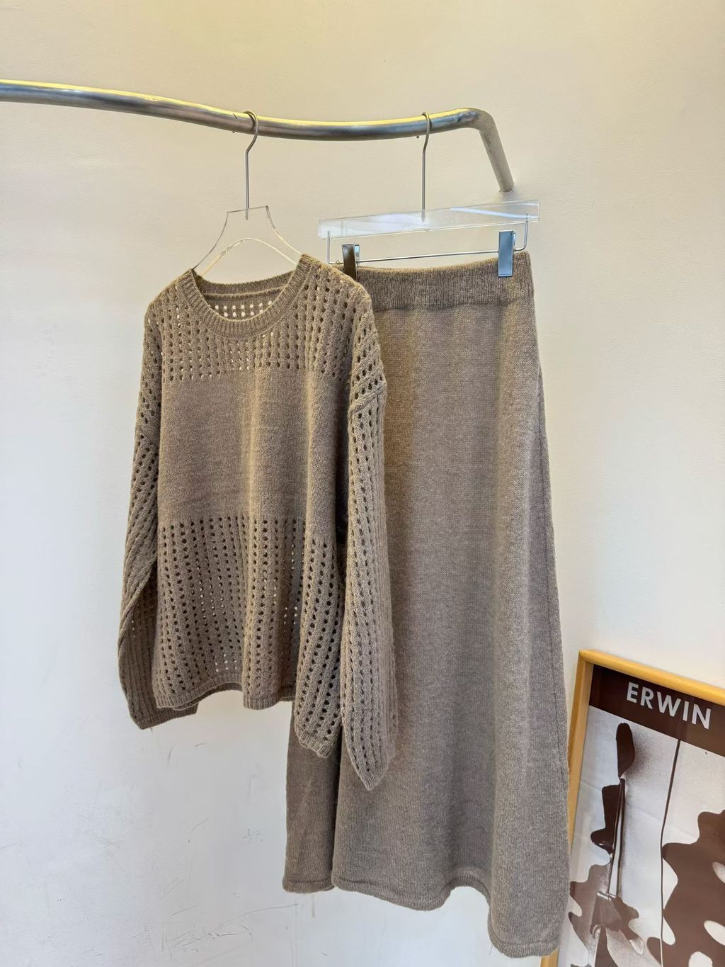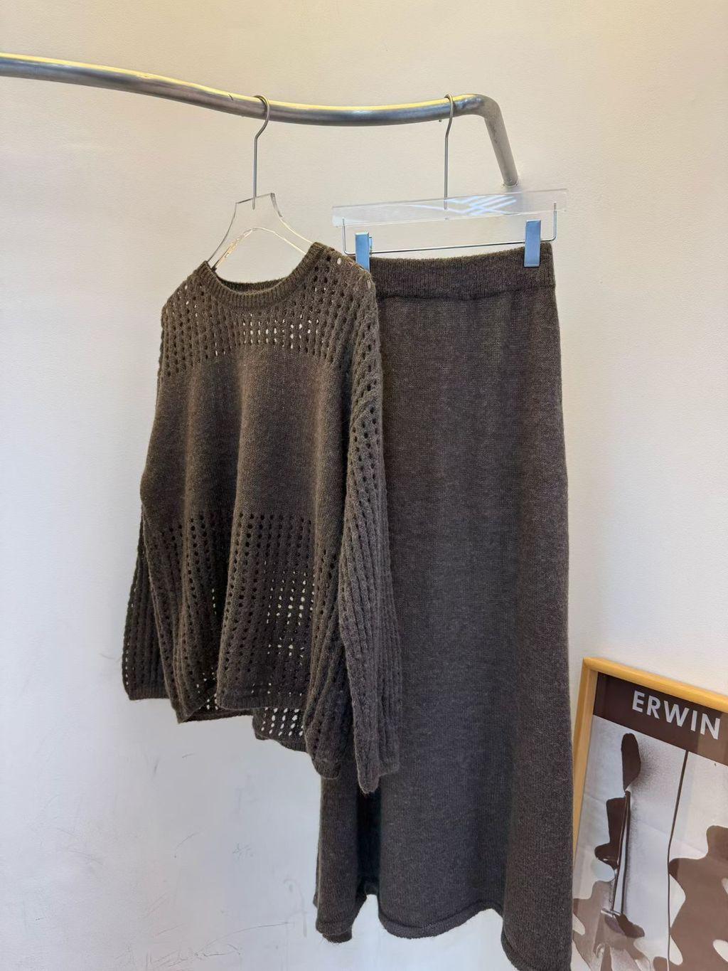 d5205-鏤空針織衫+針織長裙套裝(送針織肩包)