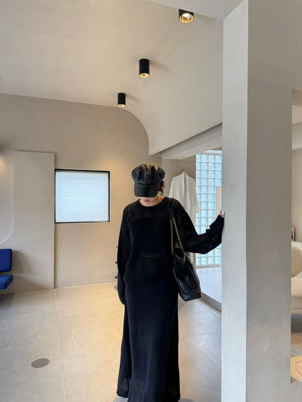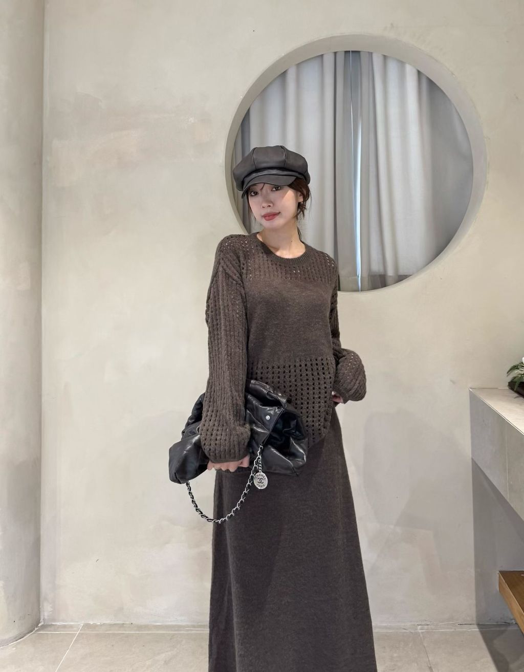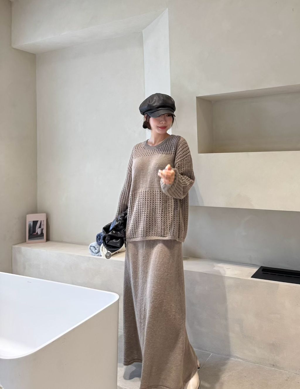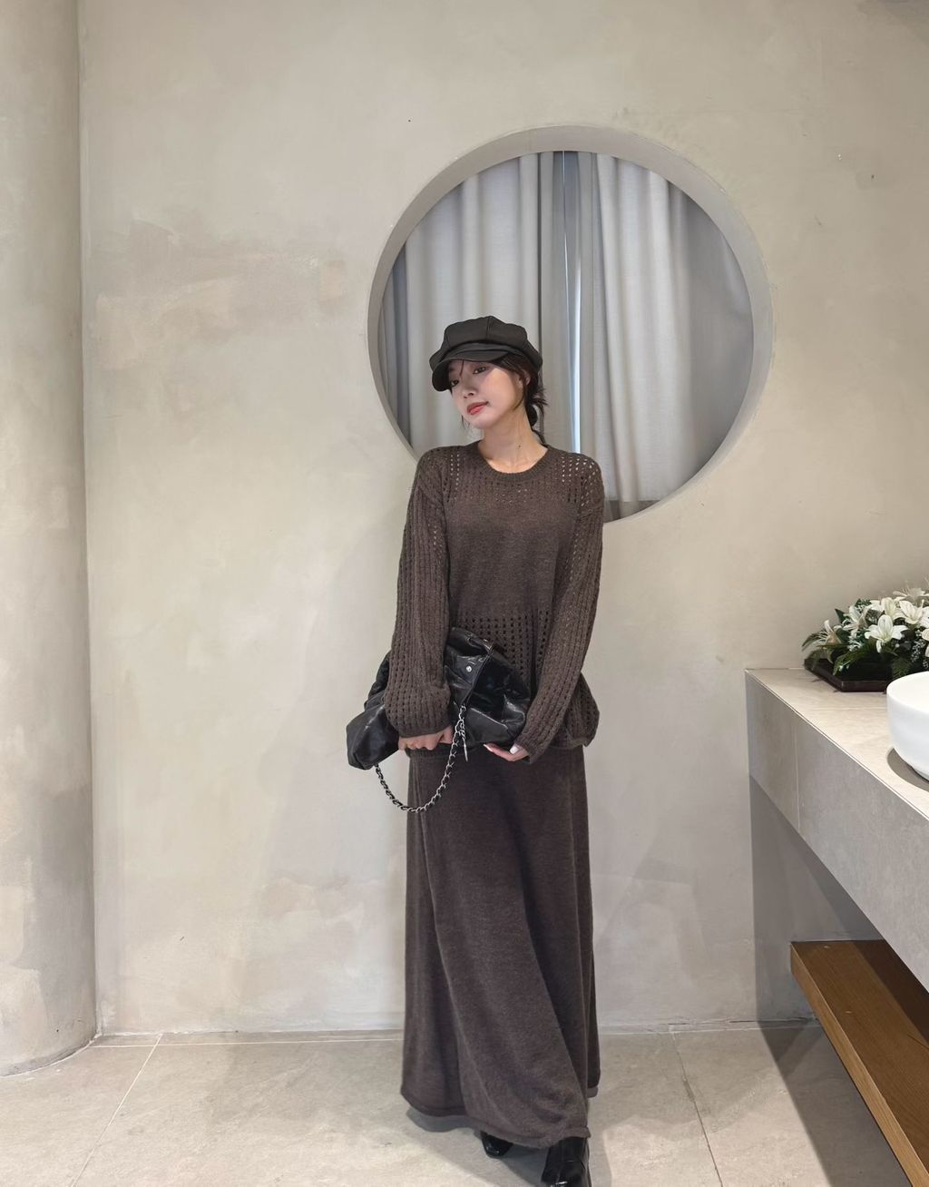 d5205-鏤空針織衫+針織長裙套裝(送針織肩包)