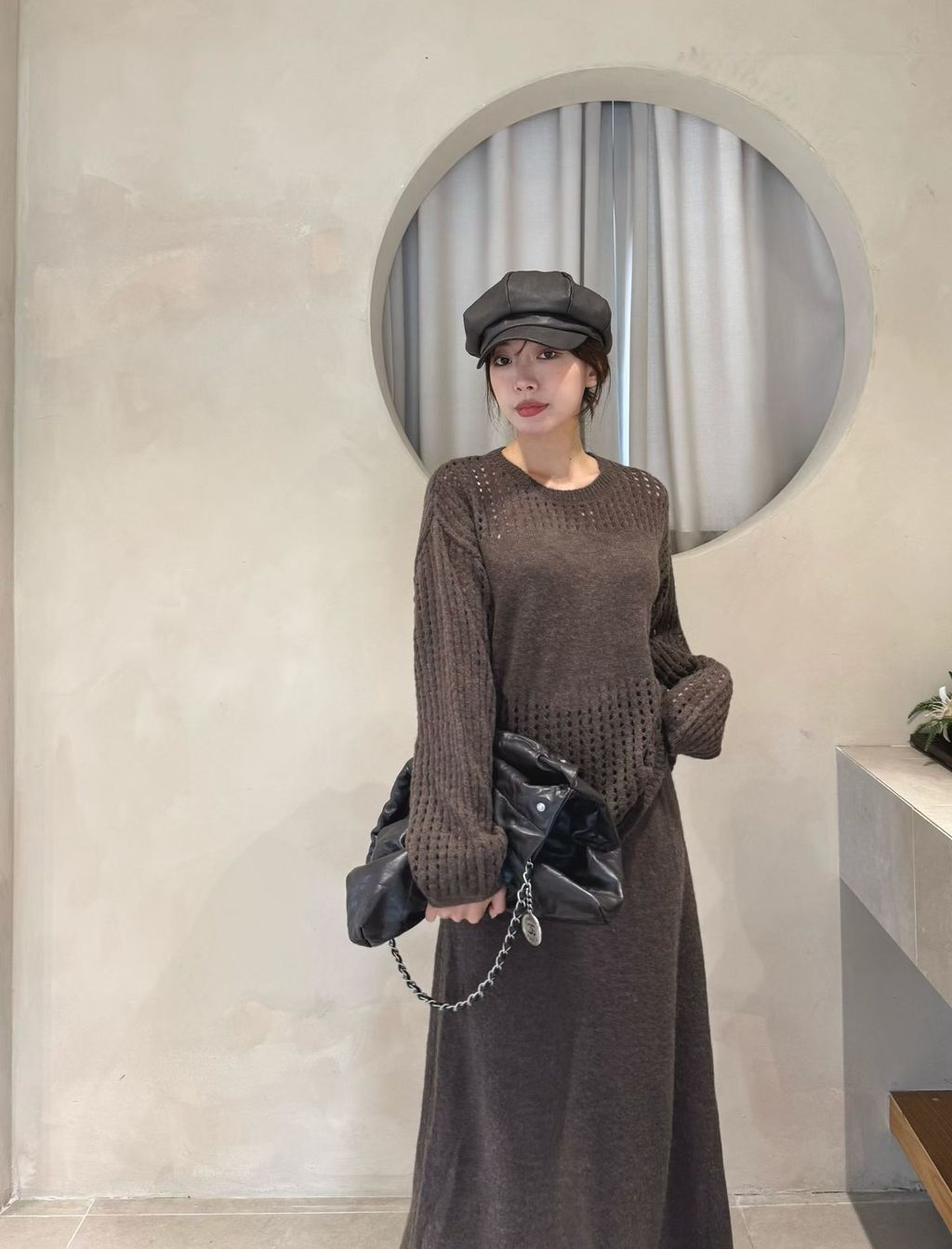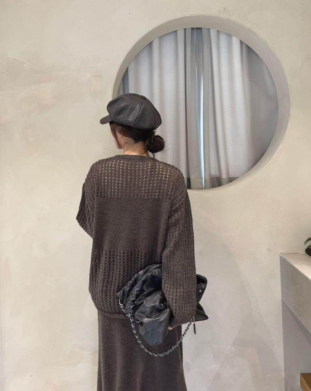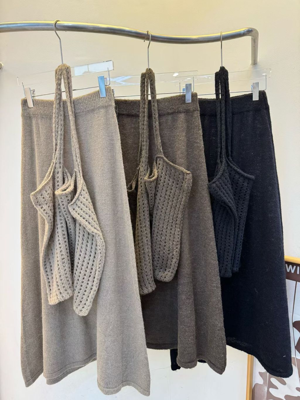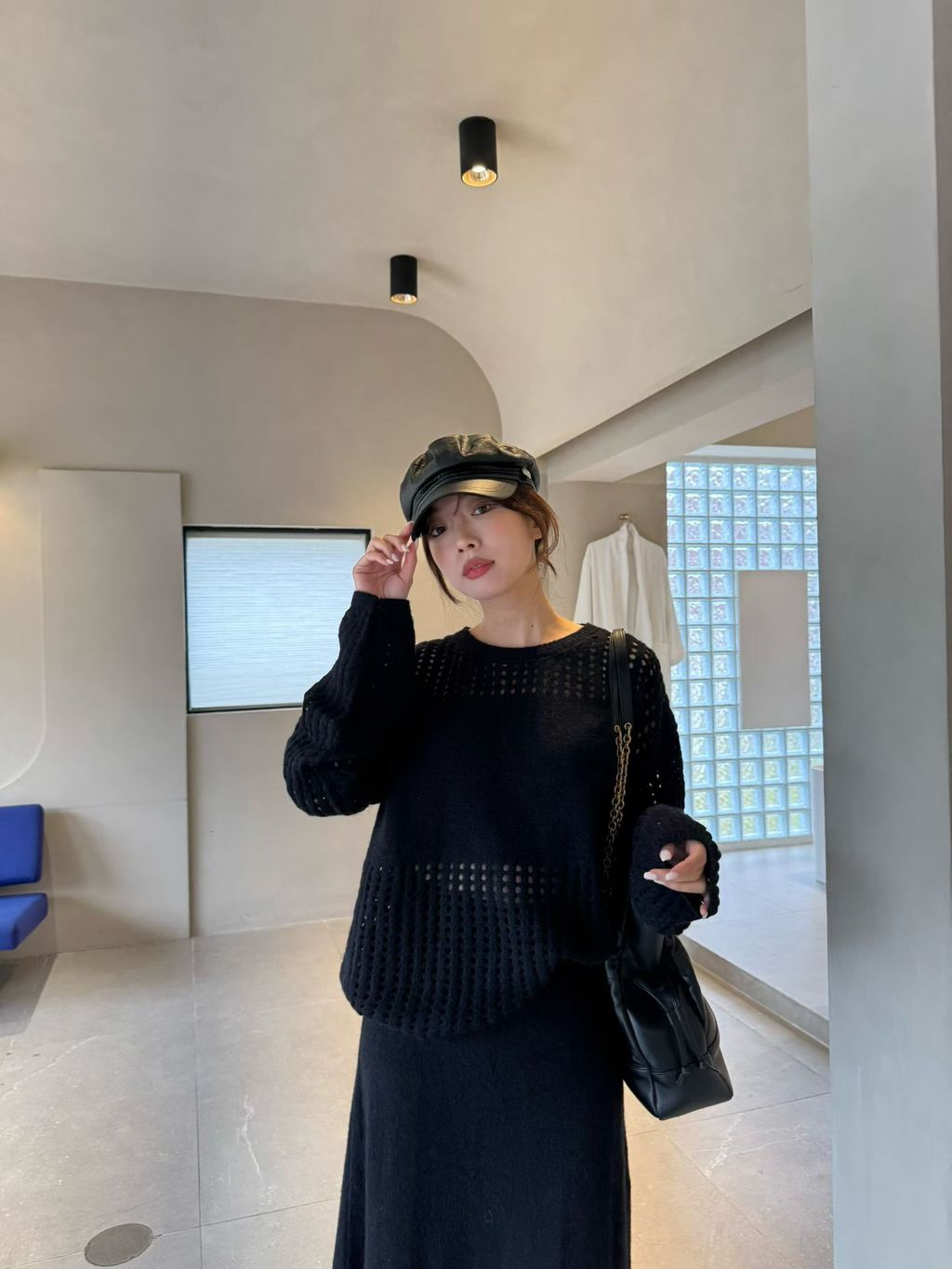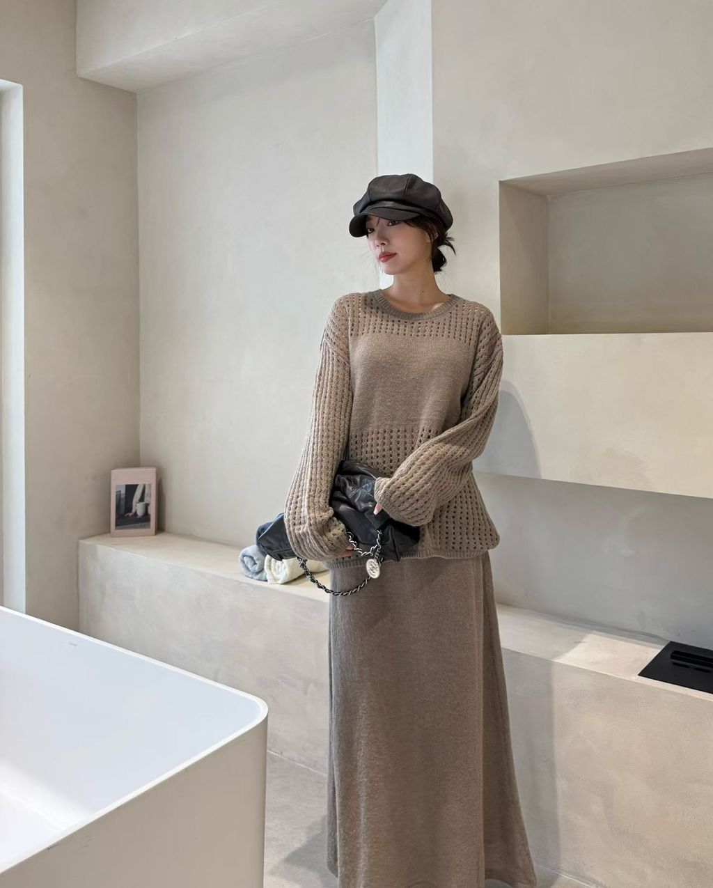 d5205-鏤空針織衫+針織長裙套裝(送針織肩包)