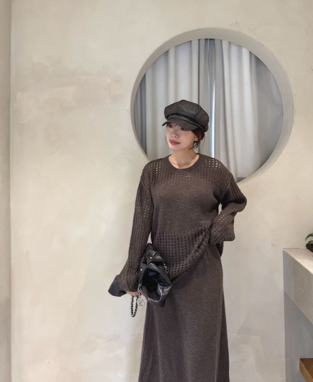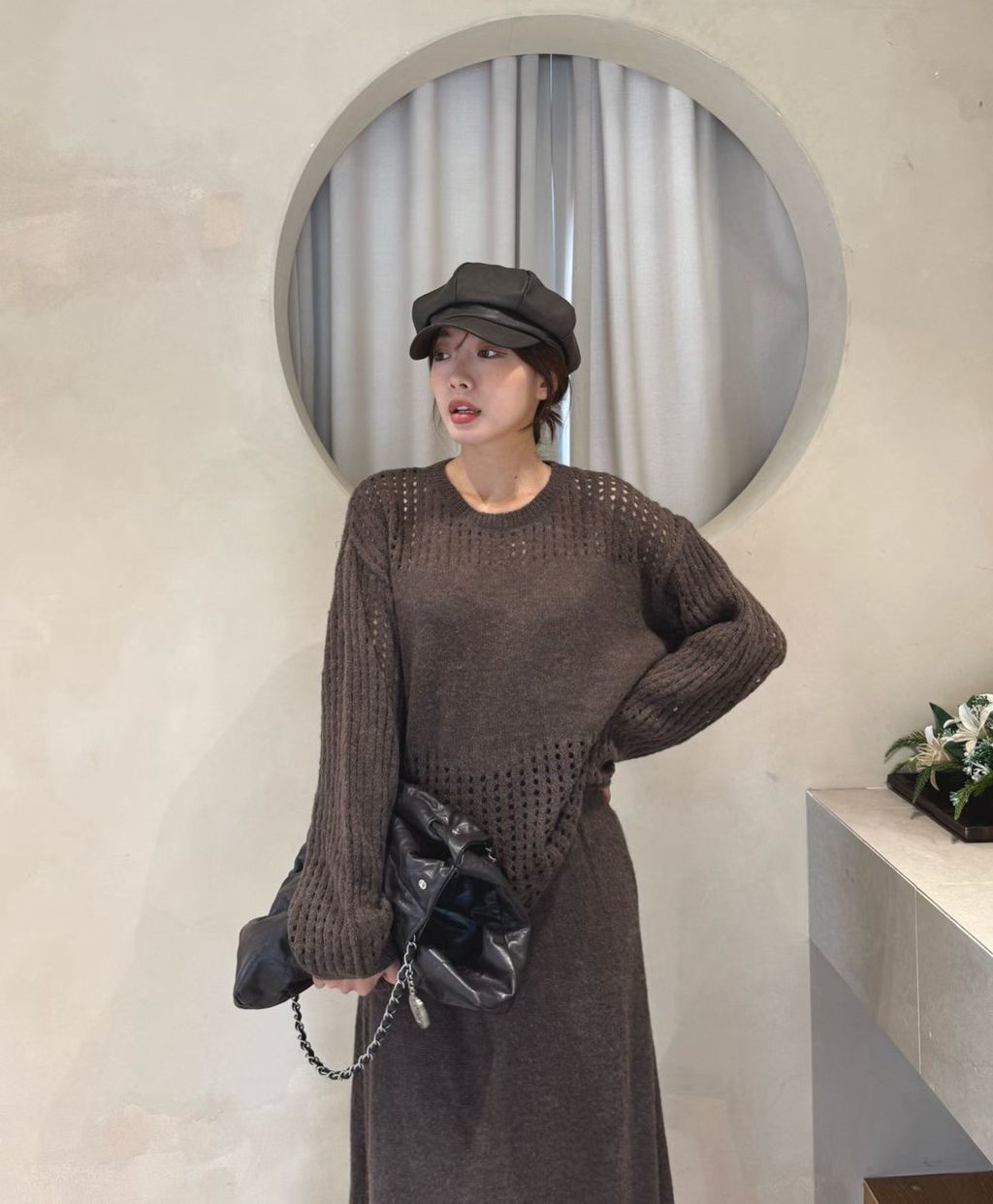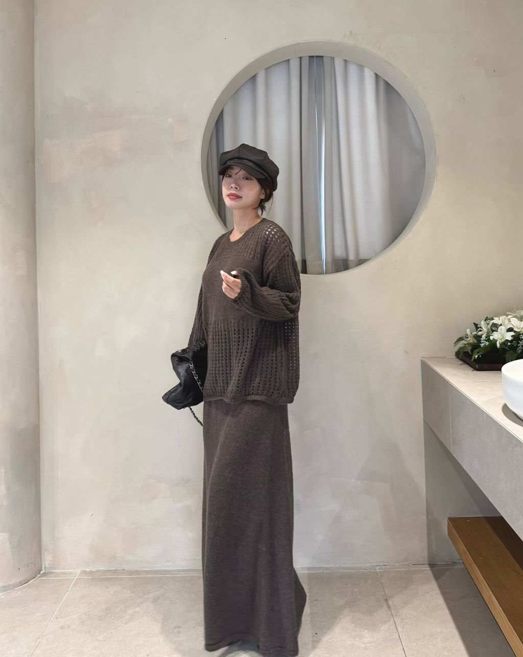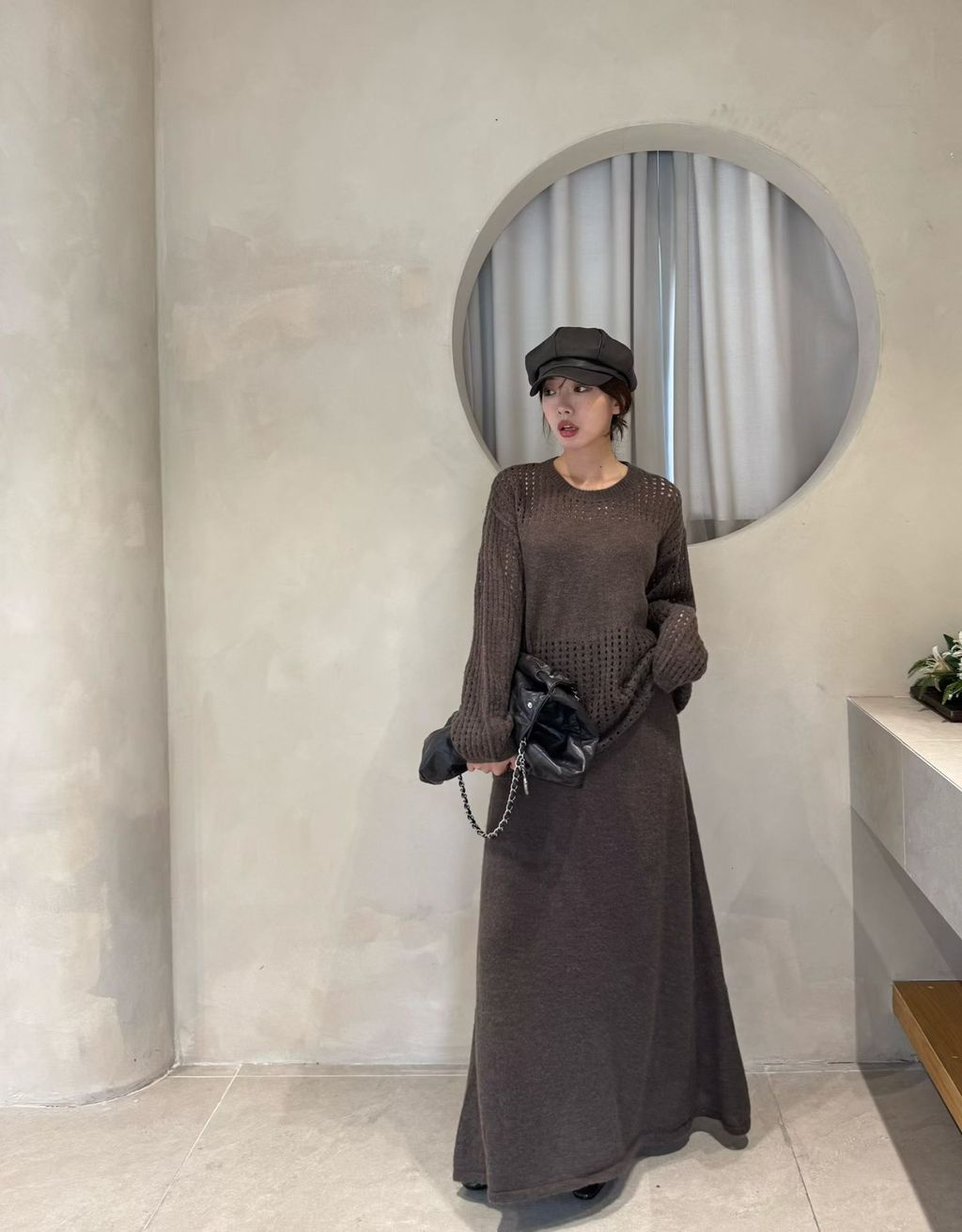 d5205-鏤空針織衫+針織長裙套裝(送針織肩包)