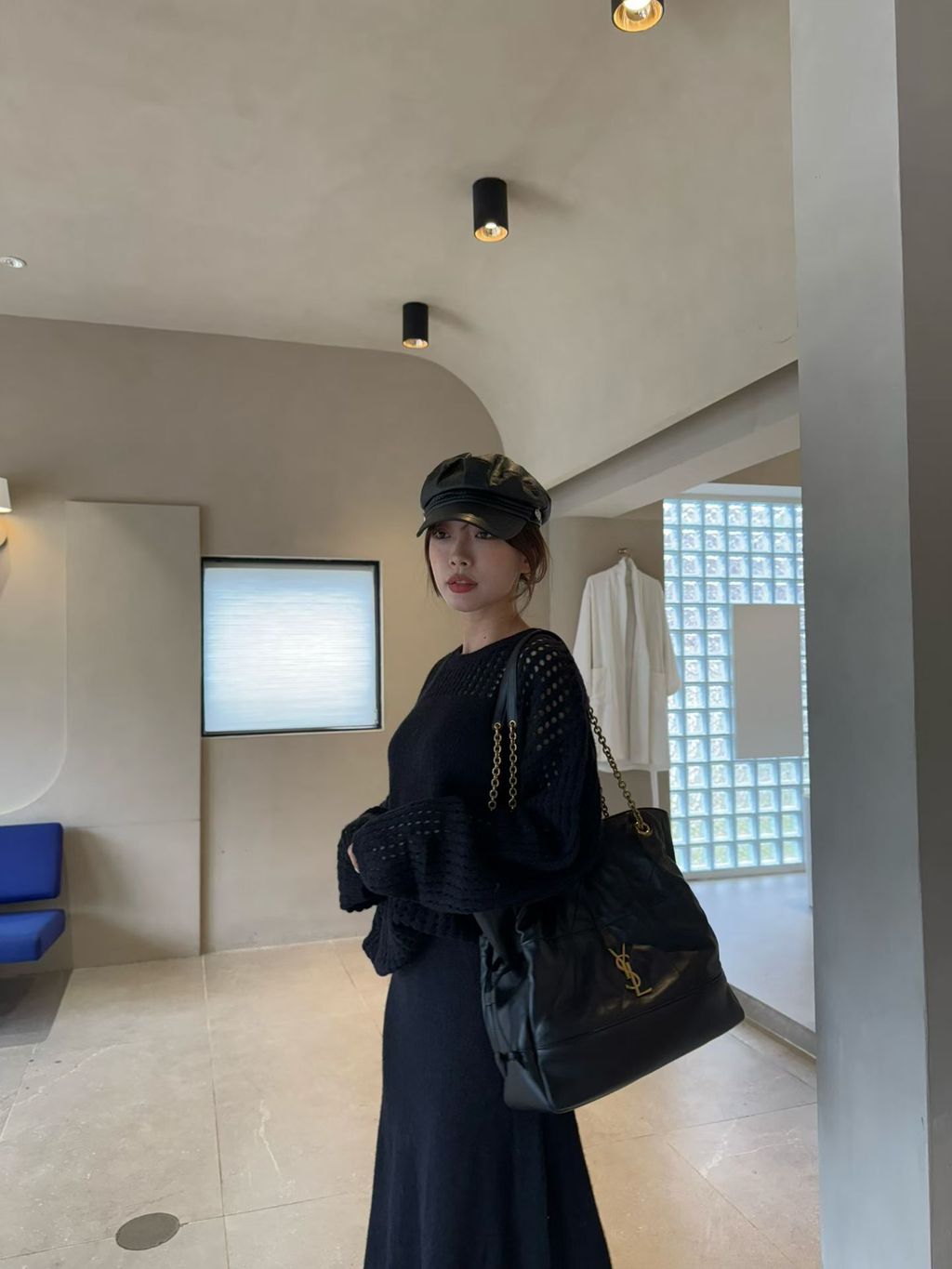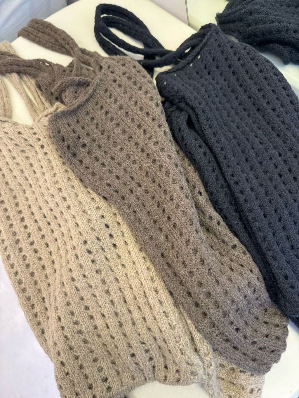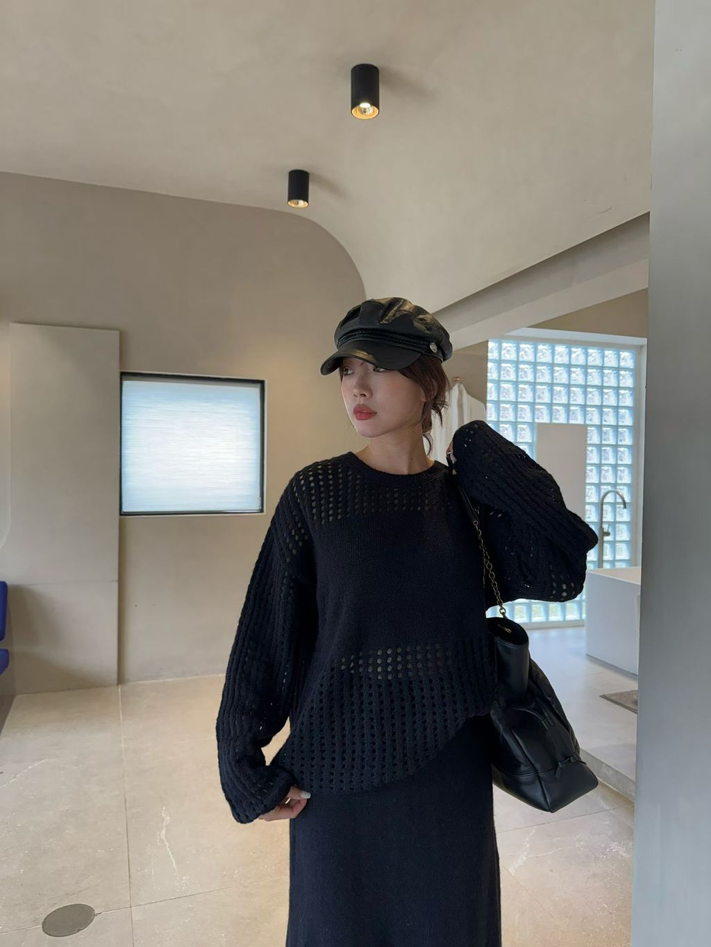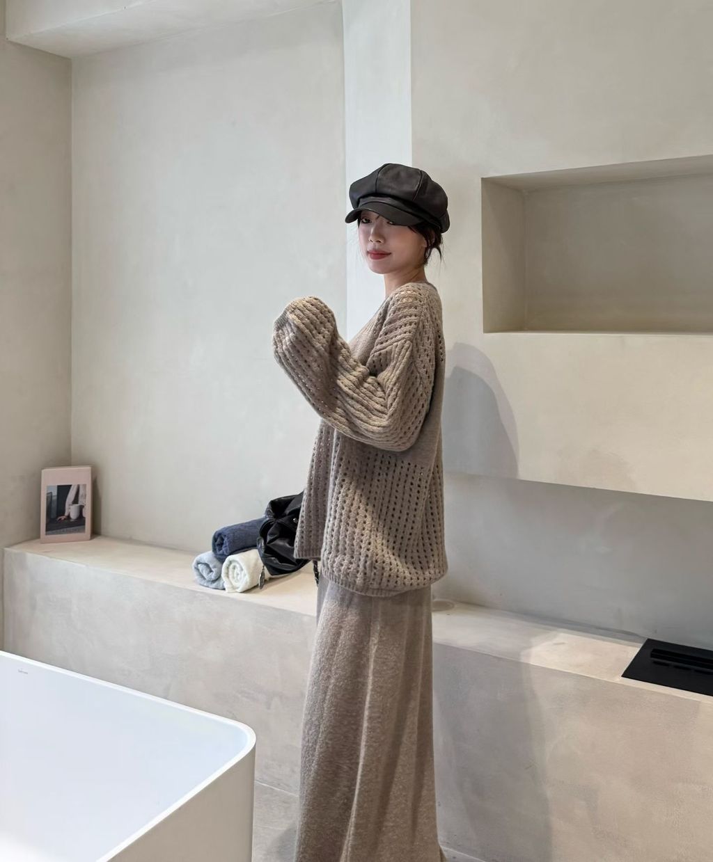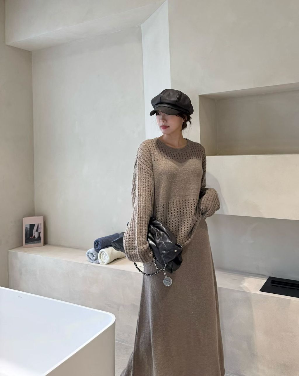 d5205-鏤空針織衫+針織長裙套裝(送針織肩包)